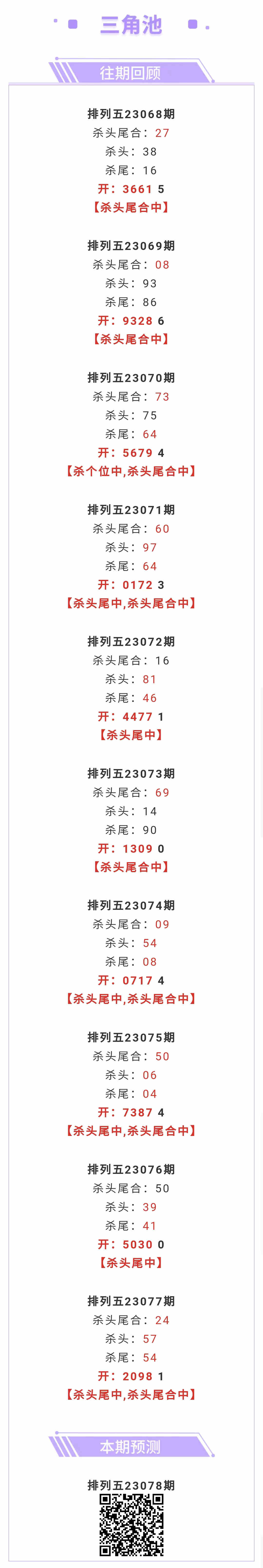 【排列五-078期】上期杀头尾中,杀头尾合中,杀头尾合近10中8;本月圈中23次杀头尾合 发表于:2023-03-29 11:52:14 浏览次数:393 上一篇: 下一篇:没有了 【独胆英雄】 范围码15红11 点播25341期 【沧海一声笑】 范围码15红10 点播25341期 【A特法师】 范围码15红10 点播25341期 排列五杀码荣誉榜