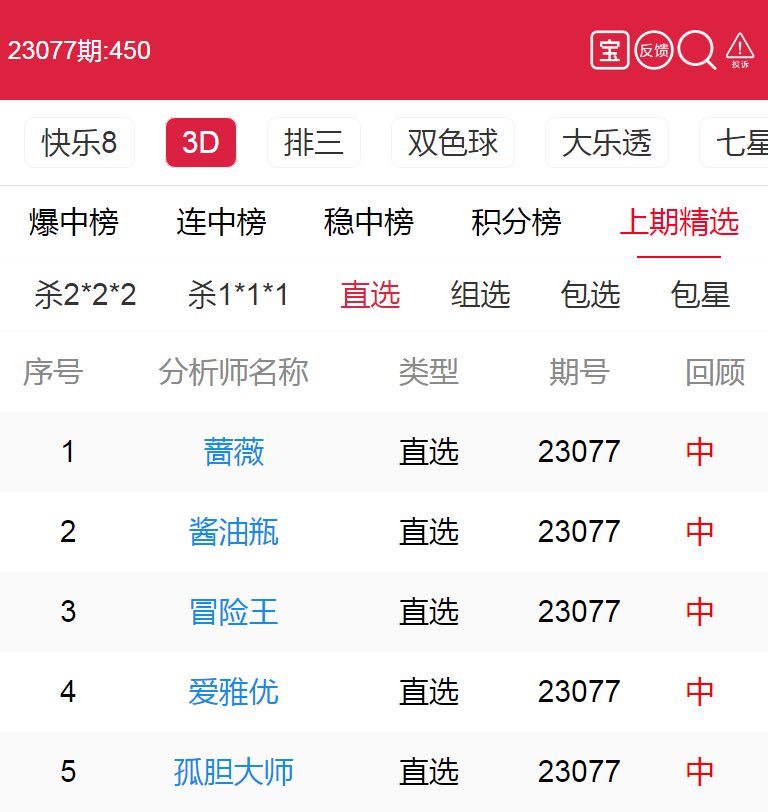 23078期:福彩3D 蔷薇、酱油瓶 等12位老师命中直选!