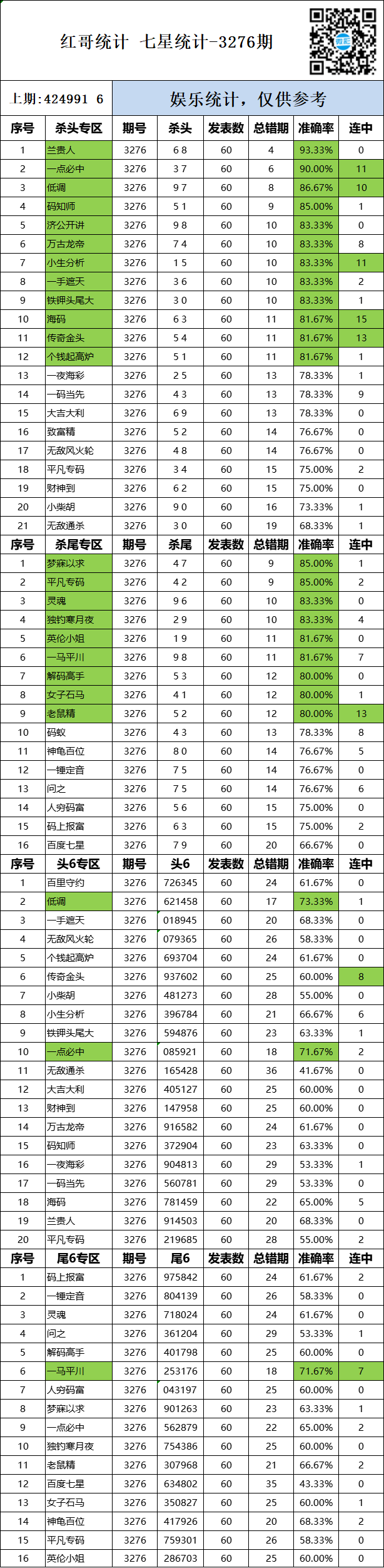 3276期:红哥统计 发表于:2025-12-10 15:00:40 浏览次数:317 上一篇:3276期:二爹统计 下一篇:3276期:二爹统计 【红炉点雪】 范围码15红13 点播25334期 【无敌通杀】 范围码15红9 点播25334期 【码上有米】 范围码15红9 点播25334期 排列五杀码荣誉榜