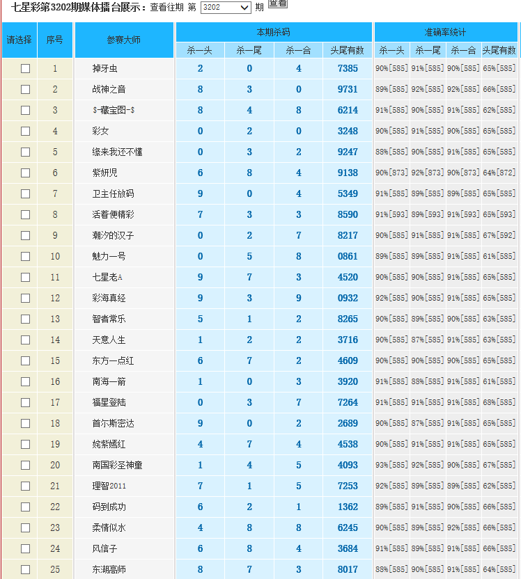 七星彩3202期特区杀一头一尾统计 发表于:2025-06-18 17:49:33 浏览次数:610 上一篇:排列五25159期点播推荐依稀少年,步步为赢和一点必中 3位分析师 下一篇:七星彩3202期特区杀二头二尾统计 【红炉点雪】 范围码15红13 点播25334期 【无敌通杀】 范围码15红9 点播25334期 【码上有米】 范围码15红9 点播25334期 七星彩杀码荣誉榜