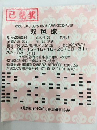 5月7日晚,福彩双色球第20034期开出02、08、15、16、26、32+03的大奖号。全国当期共开出11注单注奖金达678万元的一等奖。湖北襄阳一彩民,凭借一张9+1的复式票,收获了其中1注双色球一等奖。