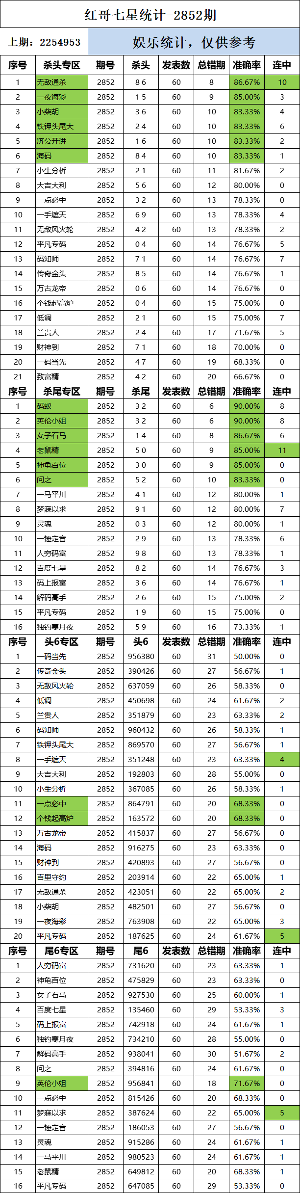 2852期:红哥统计 发表于:2023-02-25 10:46:15 浏览次数:780 上一篇:23046期《吉星高照》 下一篇:2852期:二爹统计 【红炉点雪】 范围码15红13 点播25334期 【无敌通杀】 范围码15红9 点播25334期 【码上有米】 范围码15红9 点播25334期 七星彩杀码荣誉榜