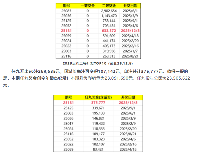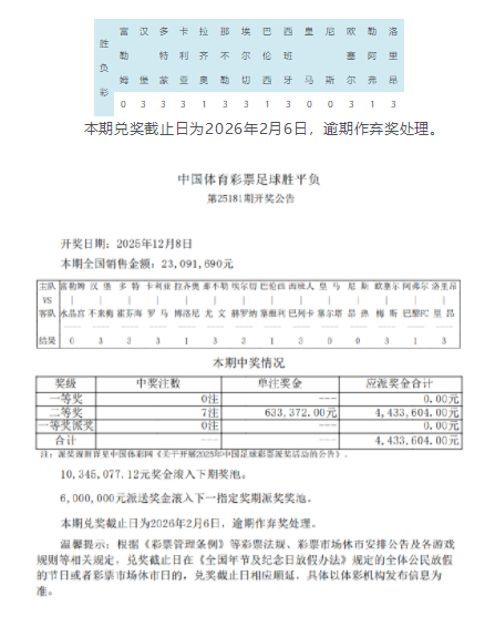 北京时间12月8日,足彩第25181期开奖结果揭晓。本期足彩头奖空开,600万派奖奖金将顺延至下期足彩派奖,即本周六(12月13日)停售的足彩,当期足彩派奖金额为1200万。另外,因头奖空开,1034万余元滚存至第25182期(12月9日)竞猜。二等奖开出7注,单注奖金高达63.3万元,二等奖金排今年第5高。