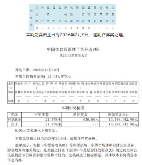 北京时间12月10日,胜负彩第25182期任九开奖结果揭晓。本期任九共开出21,578注,单注奖金639元。本期任九投注总额为21,545,870元。