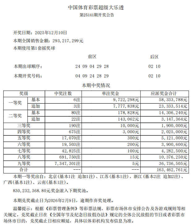 本期全国销量为2.93亿元,奖池方面,8.30亿余元滚存至12月13日(周六)开奖的第25142期。