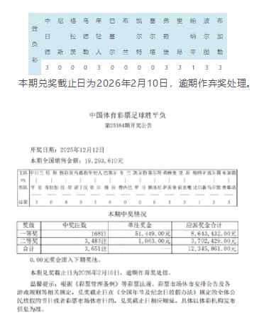 北京时间12月12日,足彩第25184期开奖结果揭晓。本期十四场头奖爆出168注,单注奖金51,449元;二等奖开3,483注,单注奖金1,063元;任选九场开18,758注,单注奖金663元。本期胜负彩销量为19,293,610元,任九投注总额为19,453,278元。