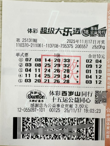 这次中奖发生在11月17日的第25131期超级大乐透开奖中。当期一等奖共开出3注,其中一注正是来自山东潍坊。中奖票是一张仅花10元购买的单式票,5注号码中,第二注“03、08、25、29、32+09、12”精准命中头奖,直接赢得了1000万元奖金。