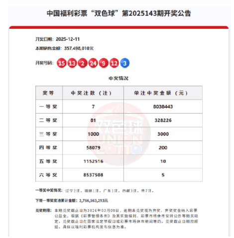 北京时间2025年12月11日,福彩双色球第25143期开奖,以下是详细