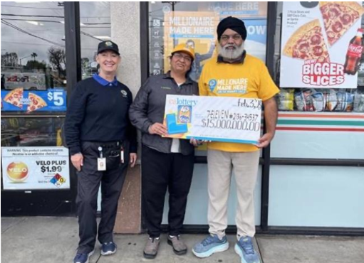 为了庆祝这一幸运时刻,加州彩票官方还向售出中奖彩票的7-11便利店颁发了7.5万美元的奖金,约合人民币53万余元。在颁奖现场,加州彩票的代表南希·韦默(Nancy Weimer)与7-11店长卡拉姆·辛格(Karam Singh)一起合影留念。