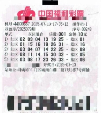2025年7月13日,中国福利彩票双色球第2025079期开奖,六注一等奖中有一注来自珠海市斗门区城南白藤二路44030667福彩销售站点。这张中奖彩票是一张投注了5注的单式彩票,最终获得8447936元奖金。7月15日上午,中奖者黄先生(化名)到珠海市福彩中心领取奖金。据黄先生透露,他是一名资深彩民,福彩3D和双色球是他最喜欢的游戏。