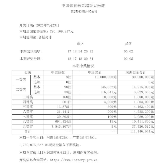 7月23日晚,体彩大乐透第25083期开奖,前区开奖号码为12、17、18、20、34,后区为02、05。本期全国共开出3注一等奖,每注奖金1000万元,其中河南中得2注,广东中得1注。二等奖开出98注,单注奖金约为14.5万元,其中33注为追加投注,每注可多得11.6万元。本期全国销量达2.96亿元,奖池余额为17.69亿元,将滚存至7月26日(周六)的第25084期。