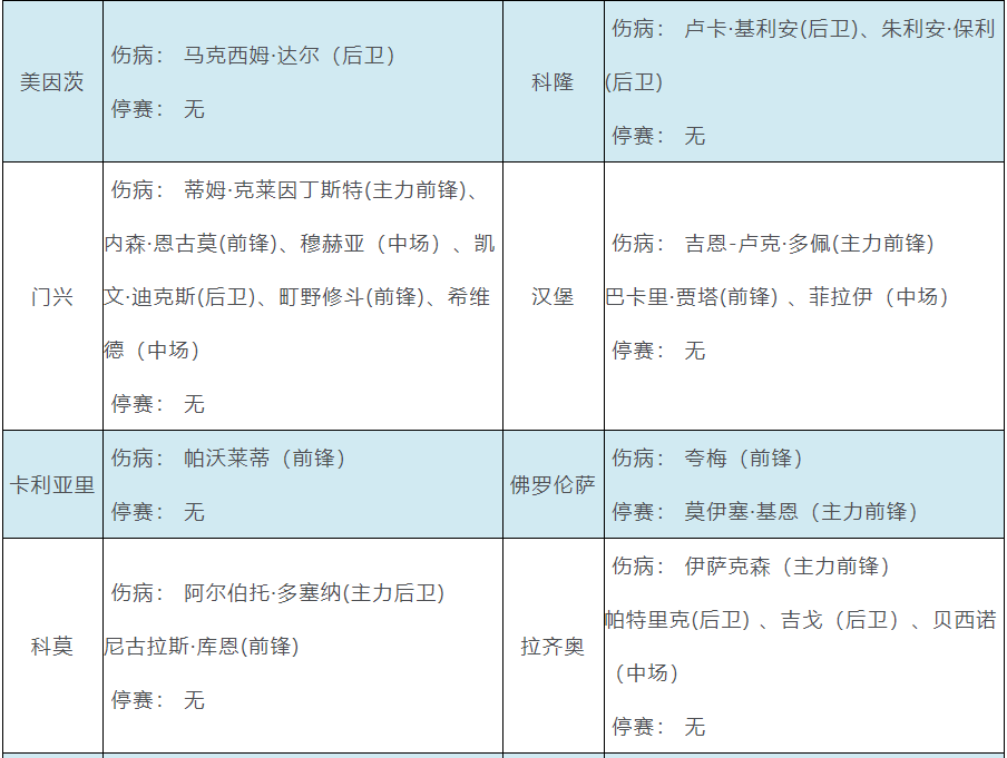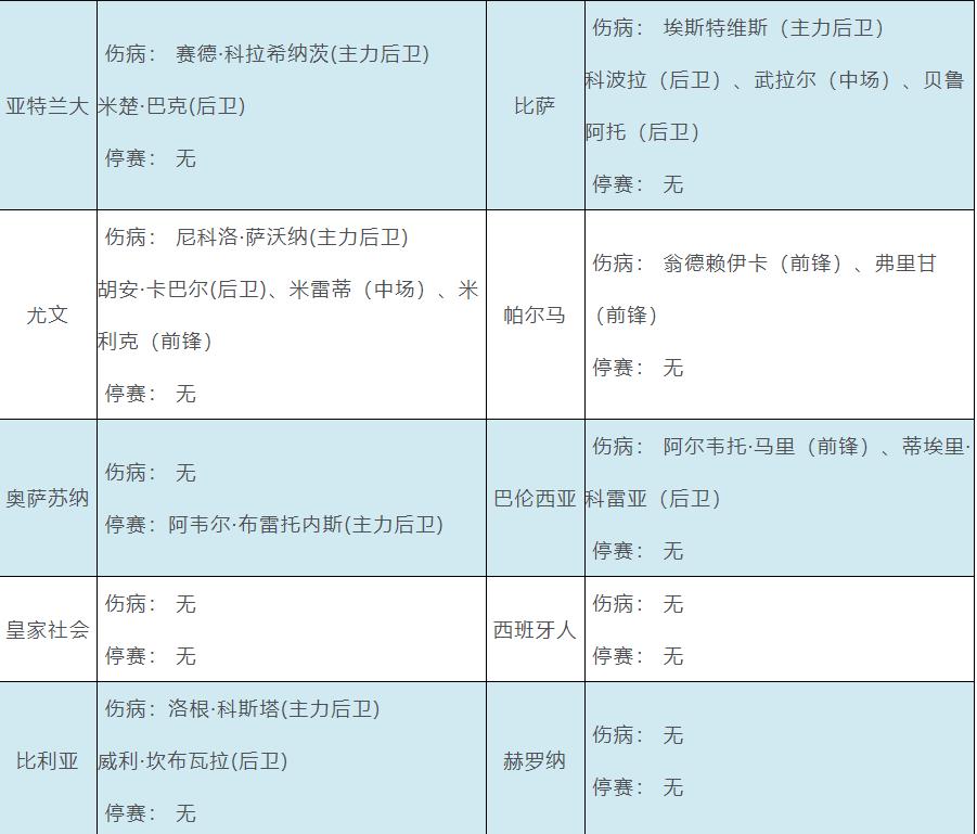 奥萨苏纳主力后卫阿韦尔·布雷托内斯红牌停赛 发表于:2025-08-24 17:43:40 浏览次数:472 伤病点评:胜负彩第25120期由英超、德甲、意甲、西甲和法甲组成。英超赛场,水晶宫中场伤病较多,埃弗顿失两大主力后卫。德甲赛场,门兴中前场伤病较多。意甲赛场,佛罗伦萨主力前锋莫伊塞·基恩停赛。西甲赛场,奥萨苏纳主力后卫阿韦尔·布雷托内斯因红牌停赛,皇马三大主力伤缺。法甲赛场,里尔失两大主力。 上一篇: 下一篇:胜负彩第25119期开奖结果揭晓 【春哥打奖】 范围码14红10 更新中 【志存高远1】 范围码14红9 更新中 【彩女】 范围码14红9 更新中 七星彩杀码荣誉榜