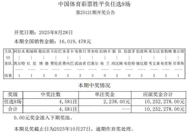 北京时间8月28日,胜负彩第25121期任九开奖结果揭晓。本期任九开出4581注,单注奖金2238元。本期任九投注总额为16,019,478元。