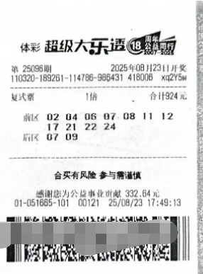 8月23日,体彩大乐透第25096期开奖,开奖中共开出12注一等奖,每注奖金769万元。南京3201051665网点的购彩者陈先生幸运中得其中1注,由于他采用了“11+2”的复式投注方式,除了收获1注一等奖外,还赢得了30注四等奖、150注六等奖、200注八等奖和81注九等奖,总奖金高达781万元。作为一位有十多年购彩经验的资深玩家,陈先生的购彩风格始终理性且从容。他并不拘泥于单一玩法,而是根据每日的开奖情况灵活选择。他坦言:“不同玩法带来不同的乐趣,选号时既能享受轻松,也能为公益贡献一份力量,算是双赢。”