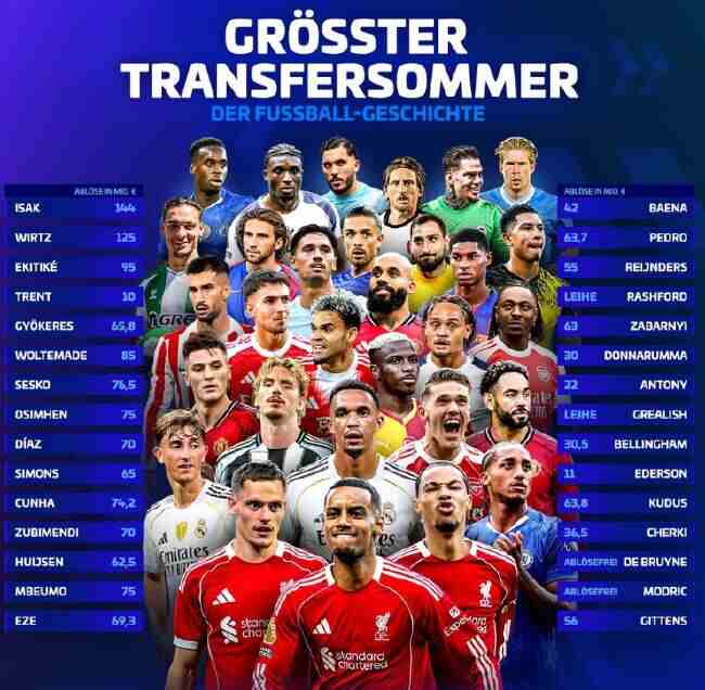 英超垄断球市在今夏霸榜可谓空前:球市投入前7球队,均来自英超,前10名中独占9席,只有勒沃库森能在此其中;花销前5的利物浦、切尔西、阿森纳、纽卡斯尔和曼联,几乎将转会排行榜变成了英超积分榜。尽管未能压哨拿下格伊,但烧掉4.18亿英镑的利物浦,也刷新了单一转会窗单一球队的投资纪录,今夏身价前三伊萨克、维尔茨和埃基蒂克全数来自红军,红军史上最贵攻击组合应运而生。