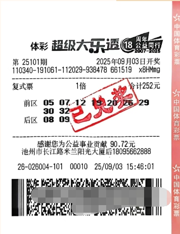 9月3日,体彩超级大乐透第25101期开奖,池州市一位购彩者凭借一张9+2复式票成功斩获1注一等奖,奖金高达823万余元。9月4日,这位幸运购彩者已前往安徽省体育彩票管理中心完成兑奖手续。