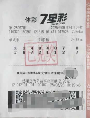 这张中奖彩票是一张8月23日购买的多期单式票,票面投注2注号码,金额仅为8元。第1注号码在第25098期中幸运中得一等奖,为李先生带来了500万元的巨额奖金。