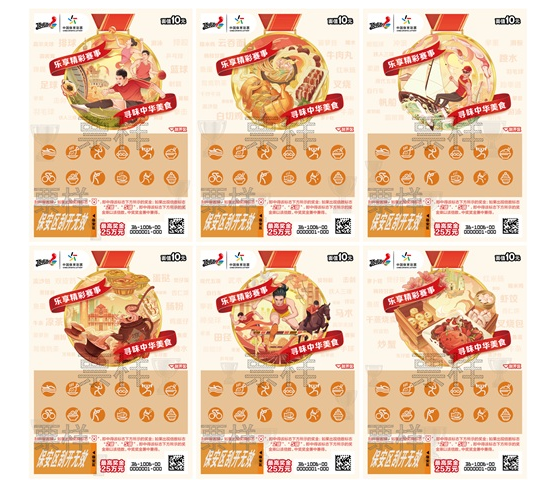“享赛事 品美食”即开票则以“乐享精彩赛事 寻味中华美食”为主题,打造体育与饮食文化的跨界盛宴。这款票面值10元,共有6个票面场景,分别展现了赛事运动精彩瞬间和粤港澳经典美食画面。