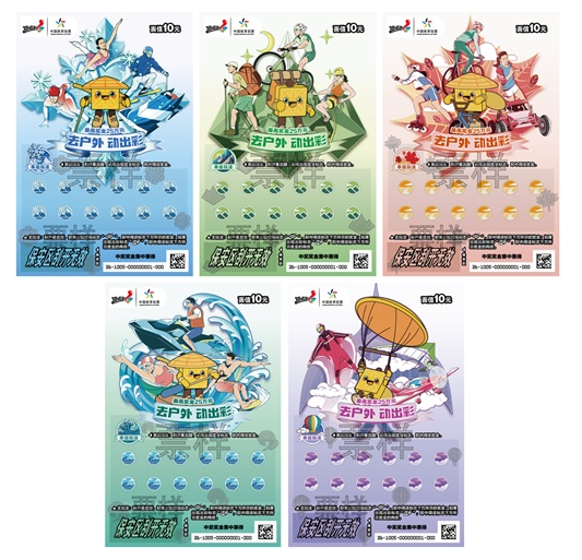 “去户外 动出彩”即开票面值10元,共有5个票面场景,以中国户外运动产业大会吉祥物“司南侠”为主形象,将传统文化与户外精神巧妙融合——“司南侠”在冰上舞动、在山野徒步、在林间骑行、在水上划桨、在云间穿梭,带领购彩者体验户外运动乐趣!