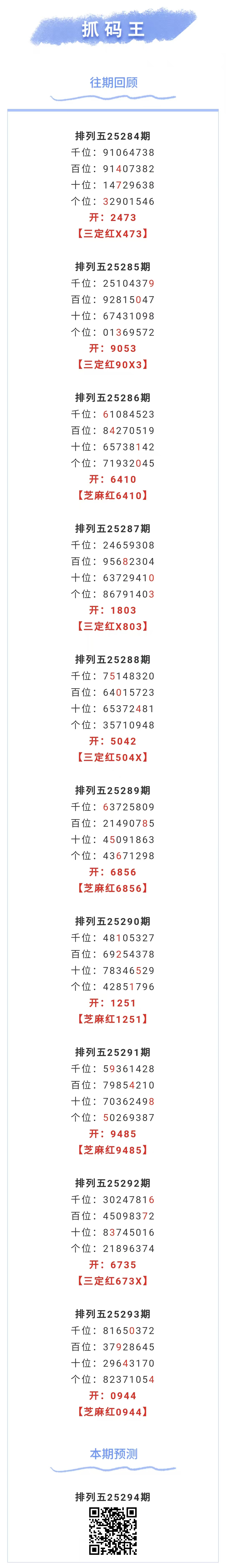 【排列五-25294期】本月圈红2次芝麻,芝麻近10红5;上期芝麻红0944 发表于:2025-11-04 11:02:18 浏览次数:314 上一篇: 下一篇:没有了 【笑语】 范围码15红10 点播25326期 【天时地利】 范围码15红9 点播25326期 【无敌通杀】 范围码15红9 点播25326期 七星彩杀码荣誉榜