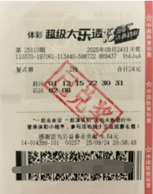 中国体育彩票超级大乐透第25110期开出的中奖号码为“01 15 22 30 31 + 02 08”,全国共中出6注基本投注一等奖,其中2注由山东济宁的王先生获得。