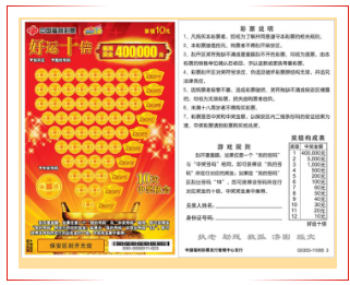 以红、黄为主色调的刮刮乐“好运十倍”,采用经典的数字对玩法,但有所不同的是,这款彩票使用“一对多”的游戏方式,使玩法既简单易记,又提供多次中奖机会,延长了游戏时间,提升了趣味性。这款游戏面值10元,共有10次中奖机会,设有12个奖级,最高奖金可达40万元!刮开覆盖膜后,如果任意一个“我的号码”与“中奖号码”相同,即可获得该“我的号码”所在行对应的奖金;如果在“我的号码”区刮出号码“10”,则可获得该号码所在行奖金的十倍,中奖奖金可兼得。