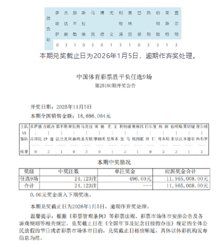 北京时间11月5日,胜负彩第25160期任九开奖结果揭晓。本期任九开出24123注,单注奖金496元。本期任九投注总额为18,696,064元。