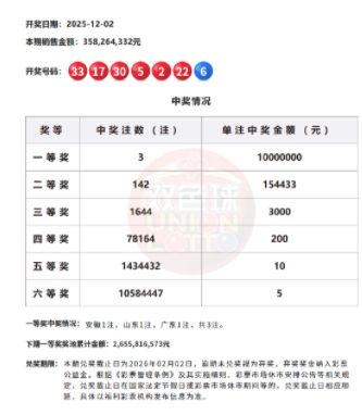 22:08 本期一等奖开出3注,单注奖金1000万元分落3地,安徽、山东、广东各1注。二等奖开出142注,单注奖金15.4万余元。本期双色球全国销量为3.58亿余元,计奖结束后奖池余额为26.55亿余元。