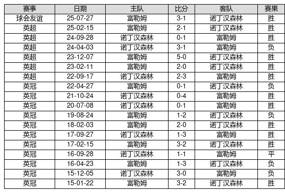 富勒姆 VS 诺丁汉森林两队近10年的交战次数为18场,富勒姆12胜1平5负,赢球概率为66.7%,平局概率为5.6%,输球概率为27.8%。