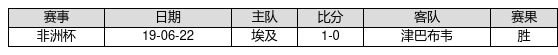 埃及 VS 津巴布韦两队近10年的交战次数为1场,埃及1胜0平0负,赢球概率为100.0%,平局概率为0.0%,输球概率为0.0%。