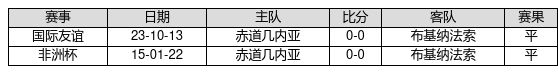 布基纳法索 VS 赤道几内亚两队近10年的交战次数为2场,布基纳法索0胜2平0负,赢球概率为0.0%,平局概率为100.0%,输球概率为0.0%。