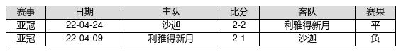 沙迦 VS 利雅得新月两队近10年的交战次数为2场,沙迦0胜1平1负,赢球概率为0.0%,平局概率为50.0%,输球概率为50.0%。