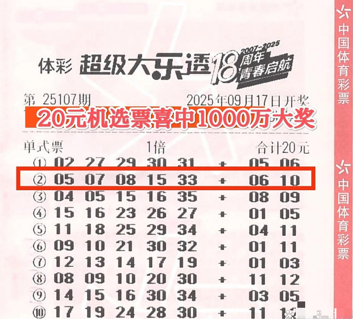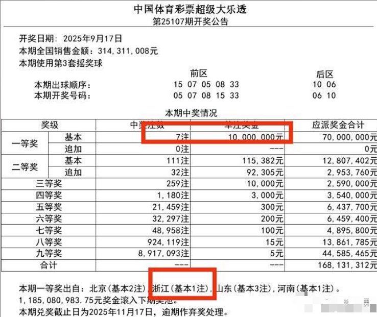 9月17日大乐透第25107期开奖中,浙江中得1注1000万元的基本一等奖。中奖者是一位来自台州的女性彩民,据她介绍这张中奖彩票是她偶然路过彩票店时进去随意机选出来的。
