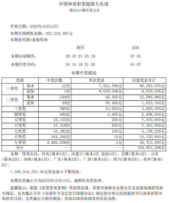 本期全国销量为3.02亿元,奖池方面,12.00亿余元滚存至10月18日(周六)开奖的第25118期。
