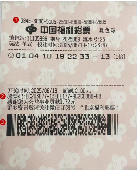 双色球彩票票面,图中1为特征码,2为验票码,3为条形码
