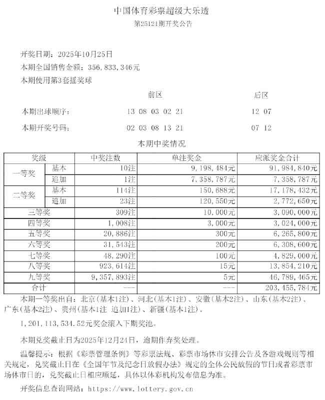 北京时间10月25日晚,体彩大乐透第25121期开奖,当期开奖号码为前区002 03 08 13 21,后区07 12。