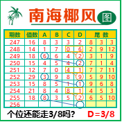 “南海椰风”第3256期推荐版局规律,本期个位38走三步.