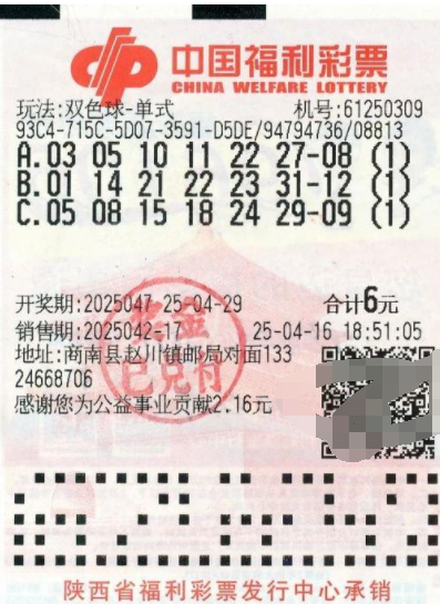 在4月29日的福彩双色球第2025047期开奖中,商洛市的一位彩民凭借6元的单式票,幸运中得千万大奖。中奖彩票在商南县赵川镇邮局附近的福彩站点售出,朱先生(化名)凭借三注守号,终于迎来了期待已久的回报。