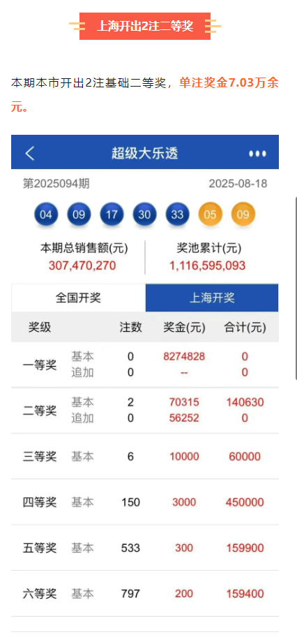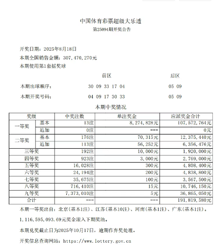 上海彩民喜中大乐透二等奖 全国共开出13注一等奖 发表于:2025-08-19 20:27:40 浏览次数:430 8月18日,超级大乐透第25094期开奖号码公布:前区为04、09、17、30、33,后区为05、09。本期全国销售总额达到3.07亿元,为国家贡献了1.10亿元的彩票公益金。 上一篇:合肥彩民喜中双色球13万元大奖 下一篇:体育总局彩票中心关于巡视整改进展情况的通报 【春哥打奖】 范围码15红11 点播26030期 【天意人生】 范围码15红9 点播26030期 【彩女】 范围码15红9 点播26030期 大乐透杀码荣誉榜