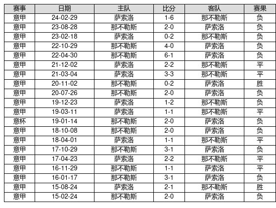 萨索洛 VS 那不勒斯两队近10年的交战次数为20场,萨索洛2胜6平12负,赢球概率为10.0%,平局概率为30.0%,输球概率为60.0%。