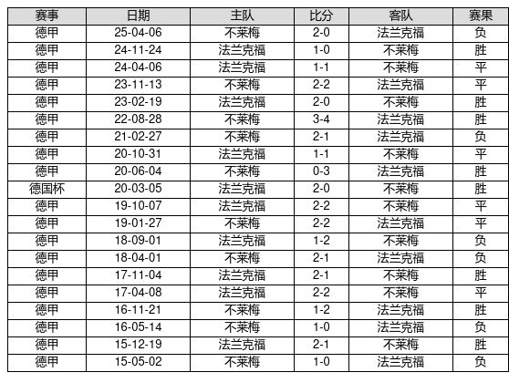 法兰克福 VS 不莱梅两队近10年的交战次数为20场,法兰克福8胜6平6负,赢球概率为40.0%,平局概率为30.0%,输球概率为30.0%。