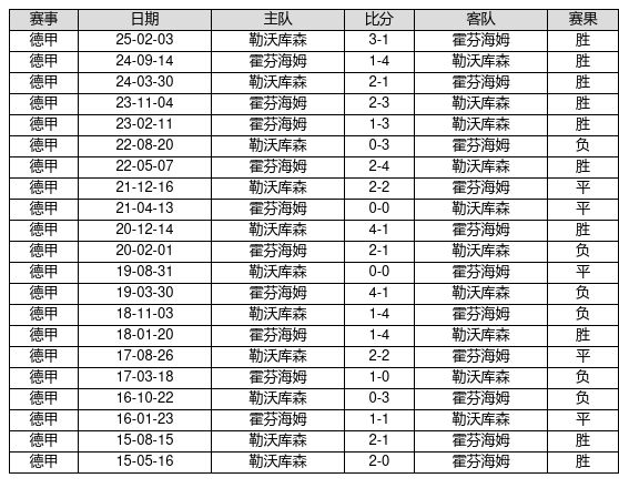 勒沃库森 VS 霍芬海姆两队近10年的交战次数为21场,勒沃库森10胜5平6负,赢球概率为47.6%,平局概率为23.8%,输球概率为28.6%。