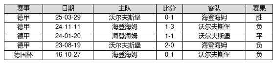 海登海姆 VS 沃尔夫斯堡两队近10年的交战次数为5场,海登海姆1胜1平3负,赢球概率为20.0%,平局概率为20.0%,输球概率为60.0%。
