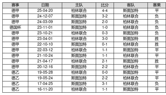柏林联合 VS 斯图加特两队近10年的交战次数为15场,柏林联合3胜7平5负,赢球概率为20.0%,平局概率为46.7%,输球概率为33.3%。