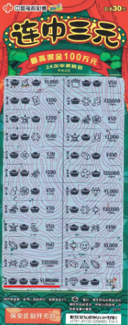 据了解,赵先生是福彩双色球的忠实玩家,深知福彩的公益属性,购彩一直保持理性,每次投注双色球金额通常不超过10元,他曾中过一次双色球三等奖,奖金为3000元。8月24日晚6点多,赵先生晚饭后散步,路过福彩125号站点,自选了5注双色球号码进行投注。当他收好彩票准备离开时,被刮刮乐展示柜台上五彩缤纷的彩票吸引。他仔细挑选后,最终选择了一张面值30元的“连中三元”彩票试试运气。