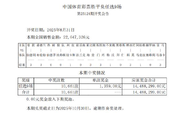 北京时间8月31日,胜负彩第25124期任九开奖结果揭晓。本期任九开出10,661注,单注奖金1,359元。本期任九投注总额为22,647,326元。