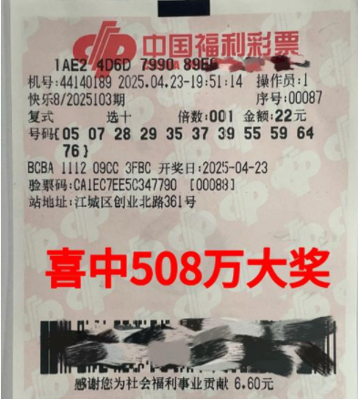 2025年4月23日,中国福利彩票快乐8第2025103期的开奖中,全国有一注“选十中十”一等奖被阳江市江城区创业北路361号44140189福彩销售站点的购彩者中得。中奖者通过一张22元的“选十玩法”11个号码自选复式票,获得了1注“选十中十”和10注“选十中九”,总奖金达到了508万元。这也是阳江市今年首个500万元以上的大奖。