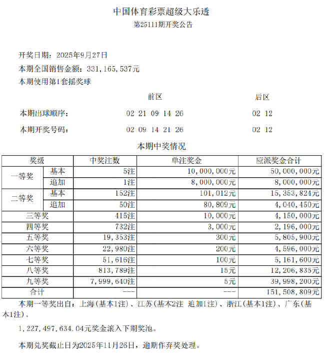 北京时间9月27日晚,体彩大乐透第25111期开奖,当期开奖号码为:前区02 09 14 21 26,后区02 12。