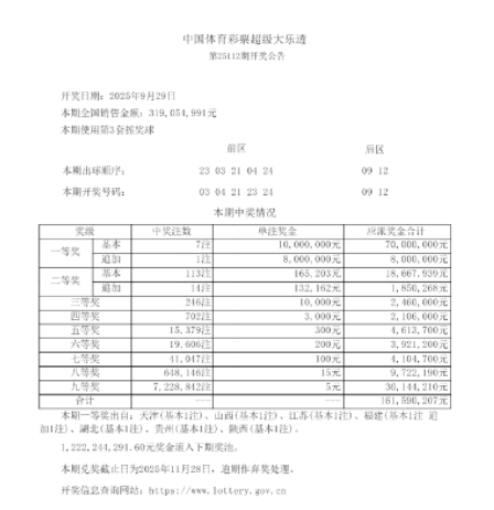 北京时间9月29日晚,体彩大乐透第25112期开奖,当期开奖号码为前区03 04 21 23 24,后区09 12。
