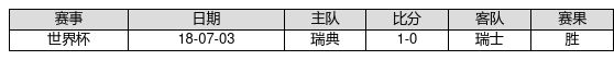 瑞典 VS 瑞士两队近10年的交战次数为1场,瑞典1胜0平0负,赢球概率为100.0%,平局概率为0.0%,输球概率为0.0%。